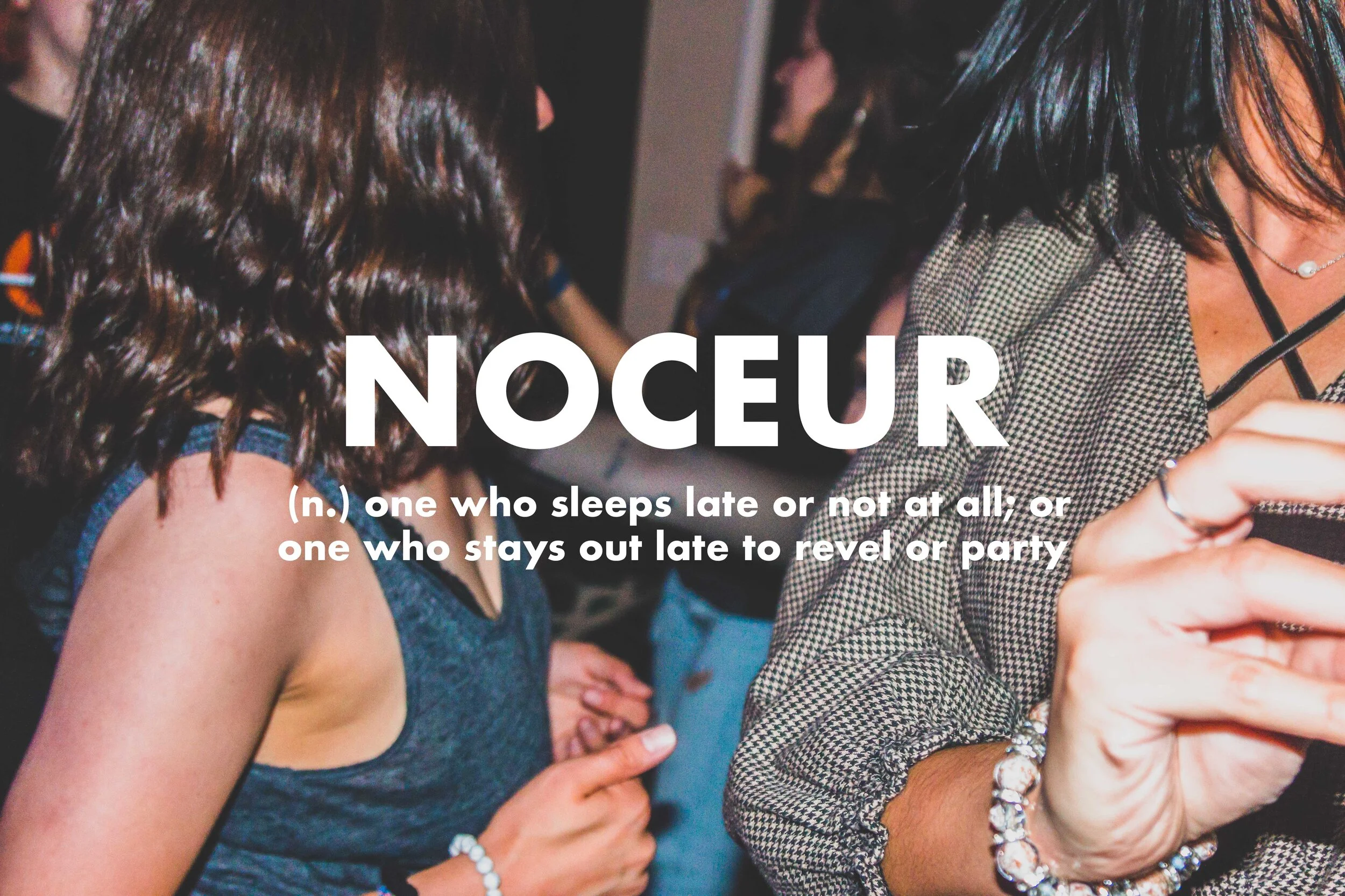Noceur (n.) one who sleeps late or not at all; or one who stays out late to revel or party.